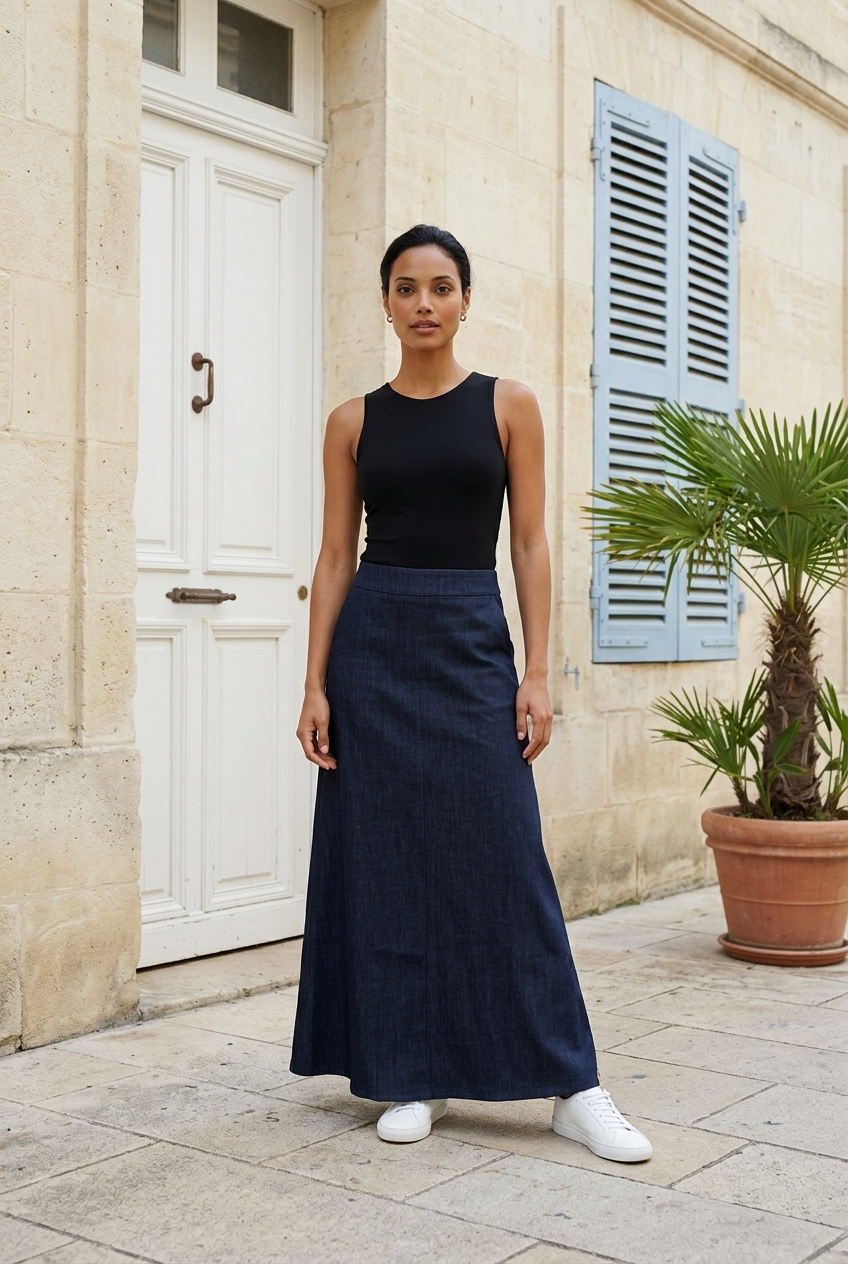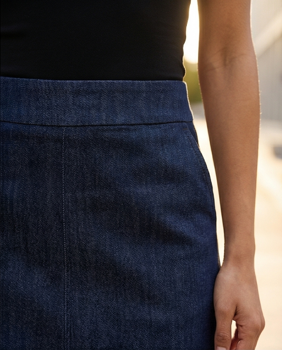 Długa, jeansowa spódnica z trzema kieszeniami w bardzo klasycznym ciemnym granacie.