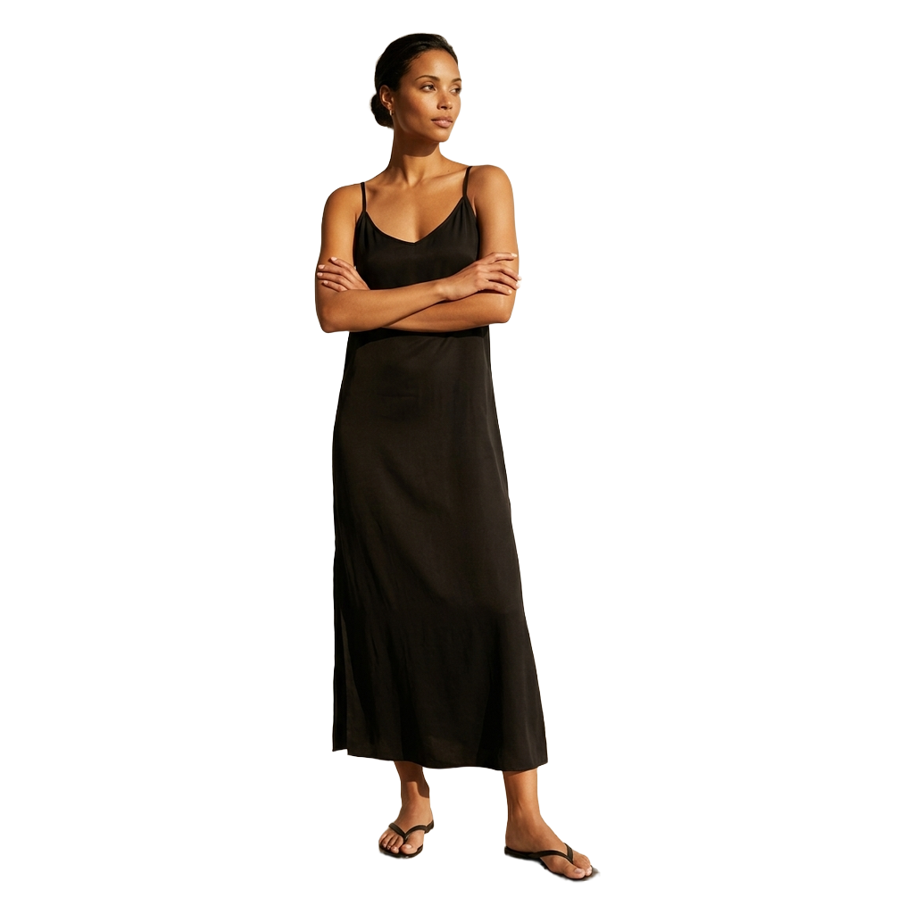 Długa, klasyczna sukienka z regulowanymi ramiączkami w czarnym kolorze. Po obydwu bokach sukienki rozcięcia na dole.