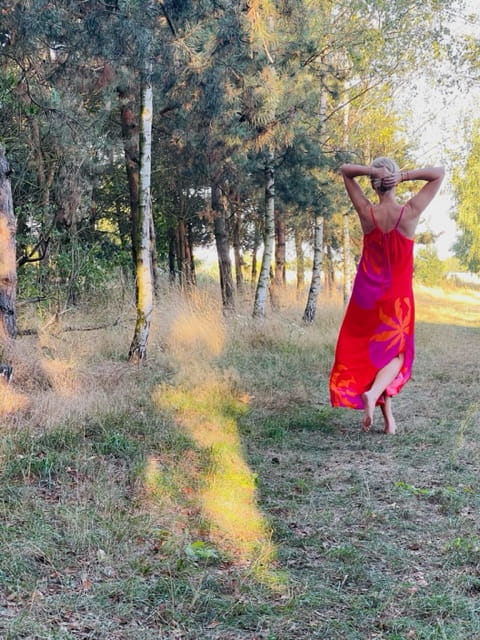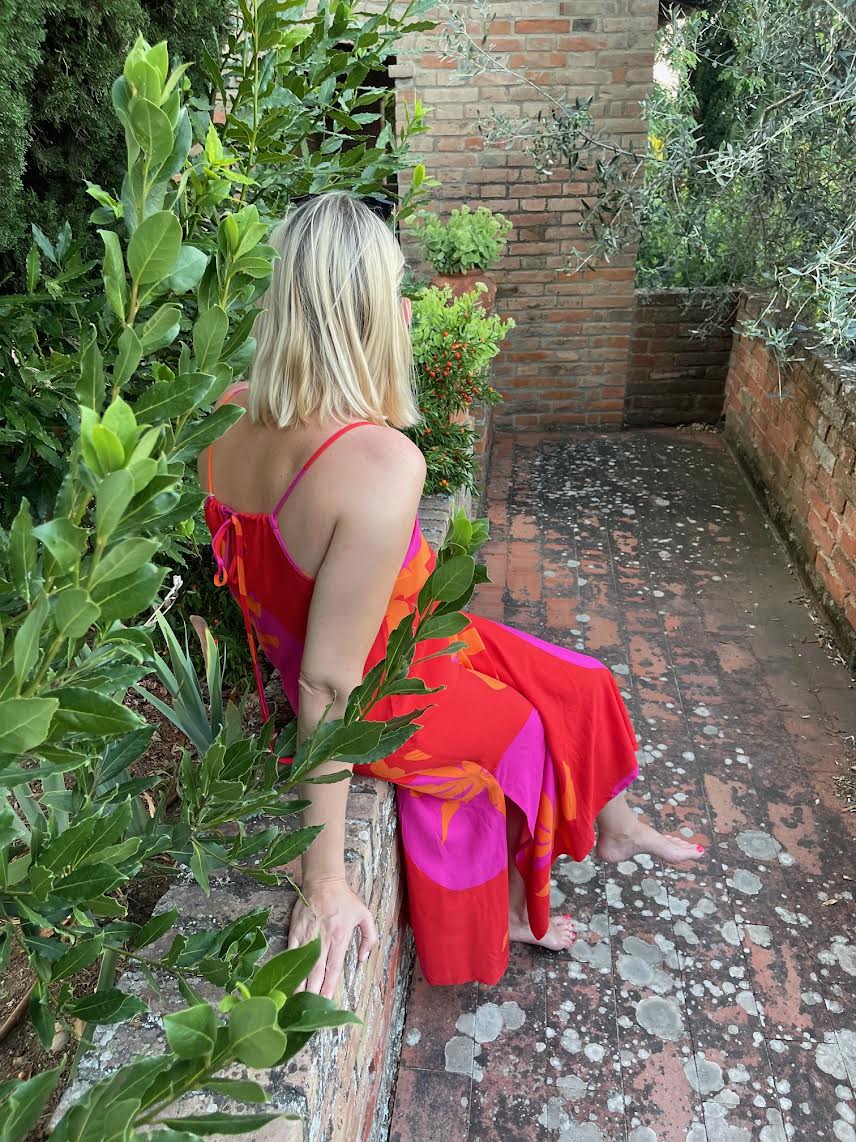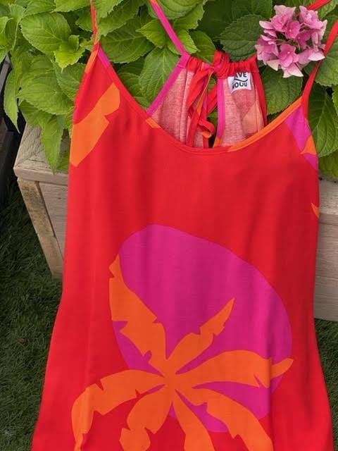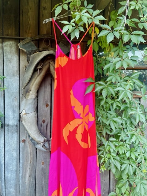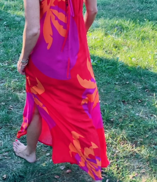 Długa, neonowa sukienka z regulowanymi ramiączkami. Po obydwu bokach sukienki rozcięcia na dole.